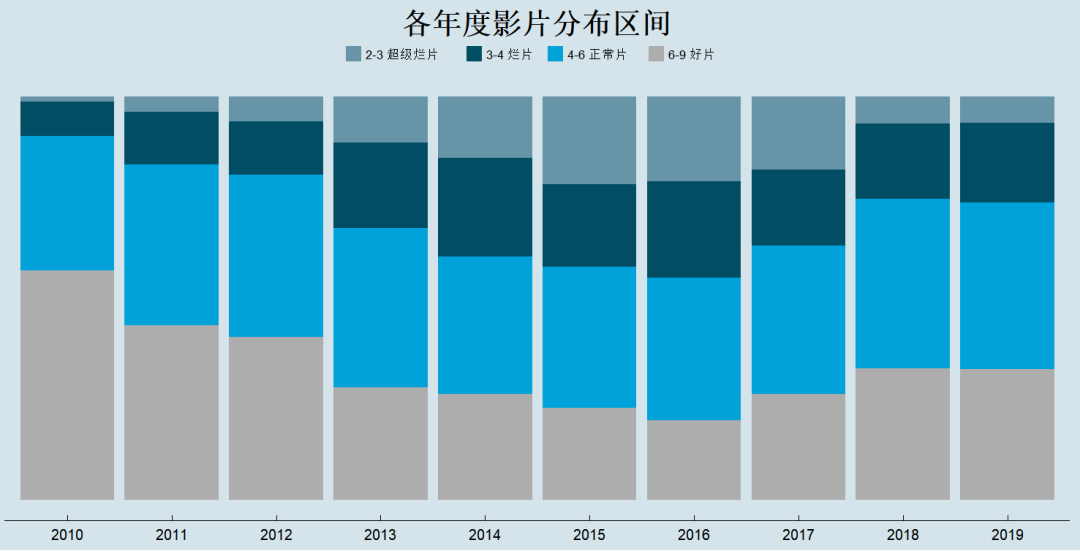 唯一一部获得9分的就是18年上映的《我不是药神》,未来也希望能有更多这样的优秀影片,而且这种期望也是有依据的,我们看一下每一年烂片和非烂片的占比:
