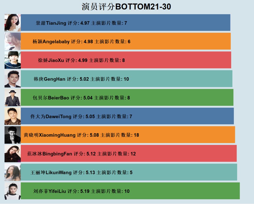看来电影和电视剧还是有所区别,在电视剧中能够大放异彩的演员未必能在电影中有同样精彩的表现,考虑到电视剧演员们的加入,继续把榜单范围放大到BOTTOM21-30: