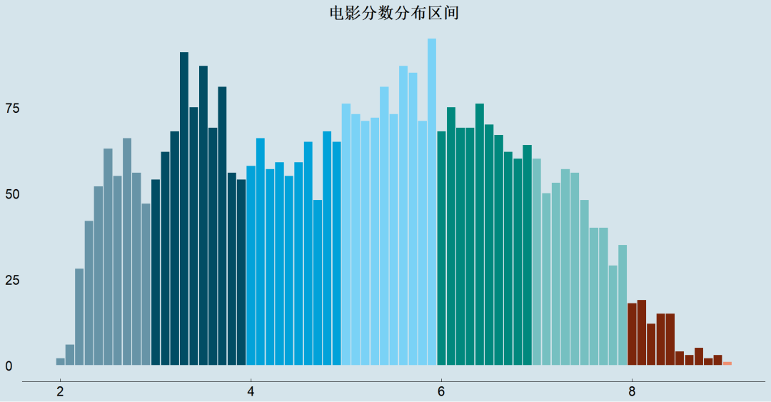 首先要做的事情就是看一下豆瓣对国产电影的整体打分情况,以此确定之后对“烂片”的划分依据,首先看一下整体评分的柱形图:
