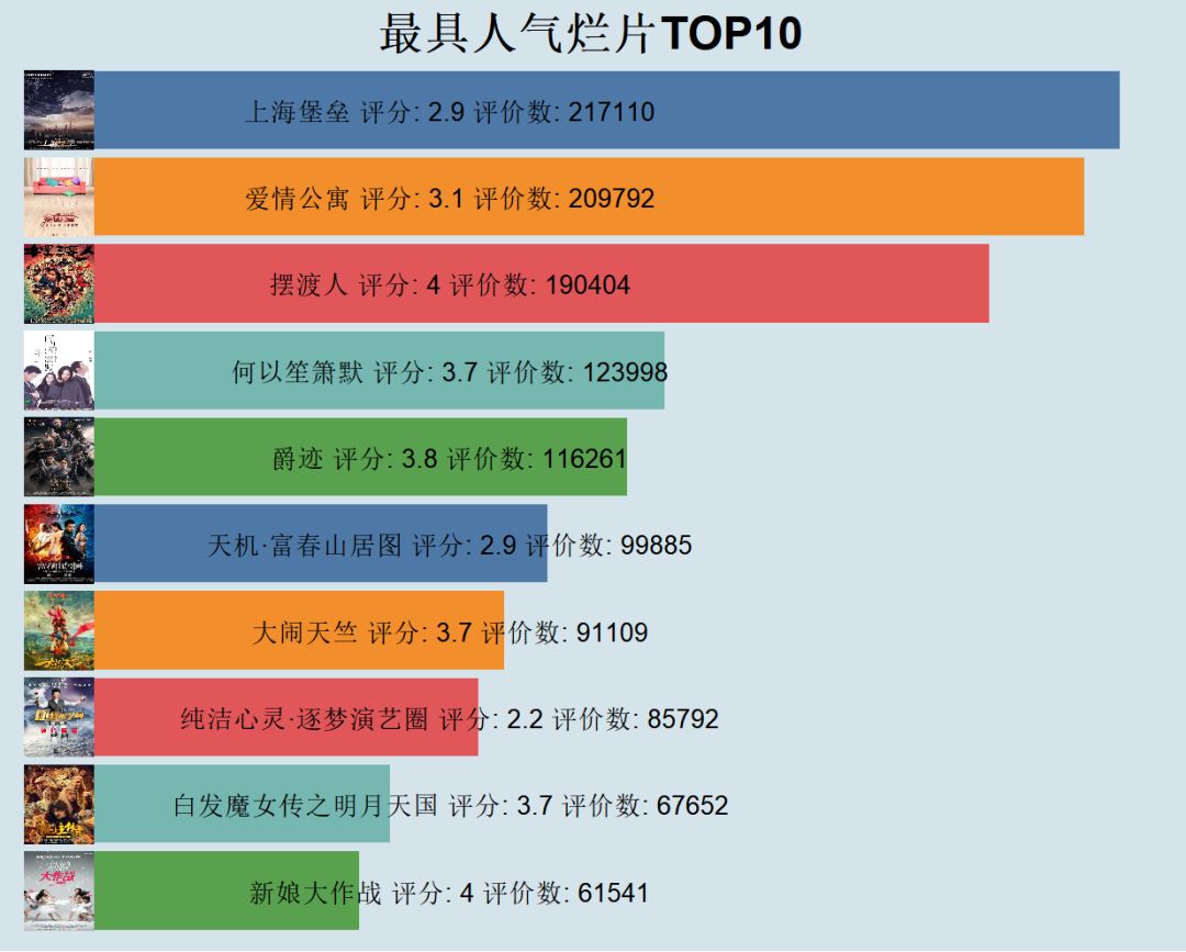 有了整体的综述后,我们确定了烂片和超级烂片的划分依据,将4分之下的影片划分为烂片,3分以下的影片划分为超级烂片,下面就分别来看看各自的人气榜: