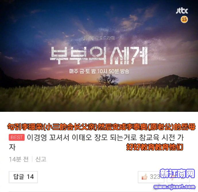 无论事业上多么成功的女性,她在社会上的价值体现,评判其是否属于“人生胜利组”的标准,始终不能逃离“身边的男人值几分”。就连韩网推荐的女主复仇计划,也包括勾引小三的父亲,摇身一变成岳母。这个看似搞笑的提议背后,折射的仍然是对男权的认同感,仿佛只有傍上一个更有权有势的男人,女主才能得到真正意义上的成功。这个现象本身不意外,可是对女性着实不公平,而当今的社会,你又很难说该如何去纠正这种不公平,最终都成了温水煮青蛙,从早前热映的电影《 82年生的金智英》也可窥见一二。