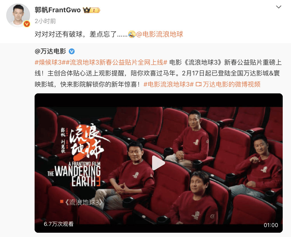 搜狐娱乐讯 21日,电影《流浪地球3》新春公益贴片重磅上线!导演郭帆转发表示:“对对对还有破球,差点忘了……”有网友在评论区问明年大年初一能不能看到《流浪地球3》上映,郭帆回复道:“当然!”