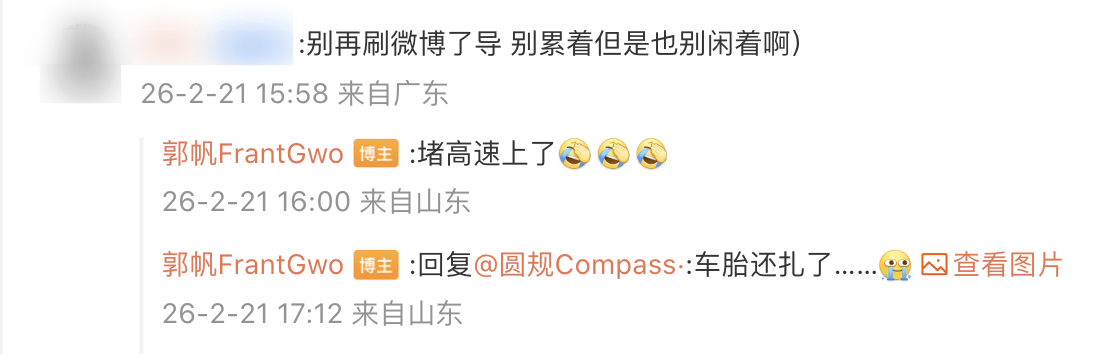 还有网友在线催促电影进程,喊话郭帆“别累着但是也别闲着”,对此,他无奈表示自己堵在高速路上了,车胎还扎了。