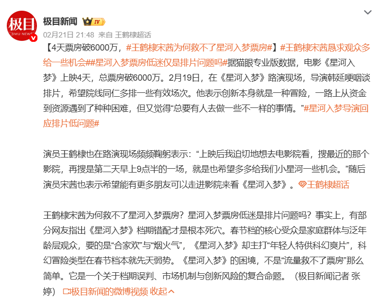 据猫眼专业版数据,电影《星河入梦》上映4天,总票房破6000万。2月19日,在《星河入梦》路演现场,导演韩延哽咽谈排片,希望院线同仁多排一些有效场次。他表示创新本身就是一种冒险,一路上从资金到资源遇到了种种困难,但又觉得“总要有人去做一些不一样的事情。”