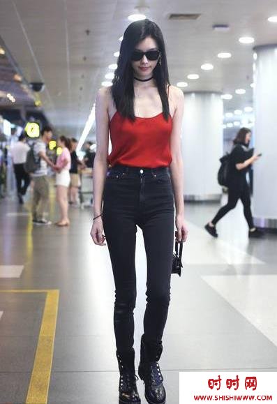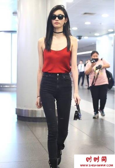2018年7月9日,北京,奚梦瑶现身机场。当天她穿一件红色吊带衫,黑色长裤秀出两条大长腿,戴着墨镜,满满超模气场。