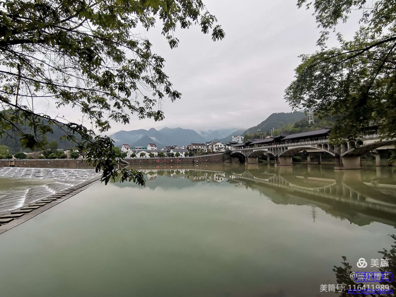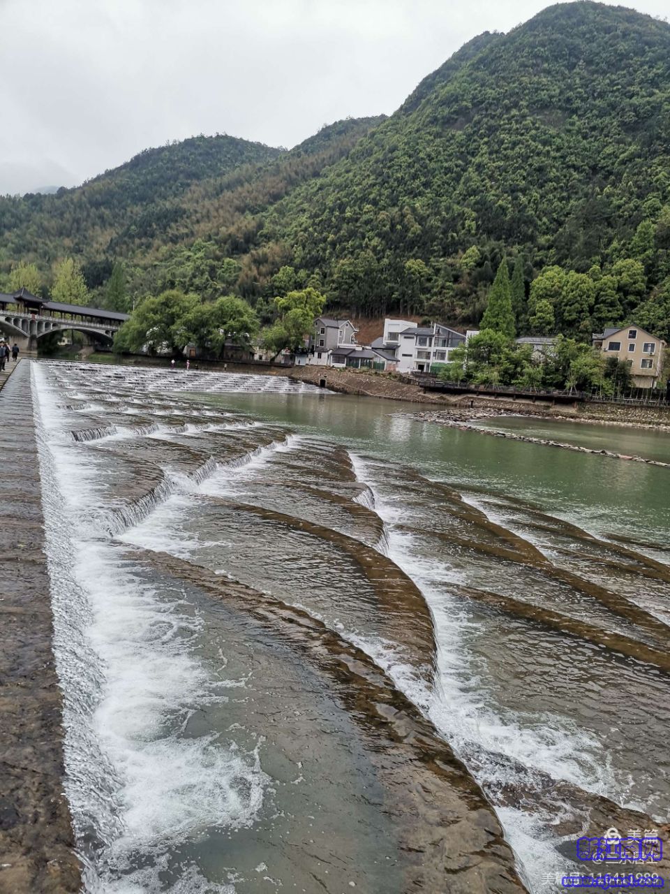 一座古色古香的廊桥连接了两岸山青水秀的乡村,龙鳞坝就座落在廊桥的下游的数百米处。大巴停在了廊桥的北侧。我们下车后,从廊桥穿桥而过。到了南岸后,顺着台阶拾级而下,再沿着汀步跨步向前。
