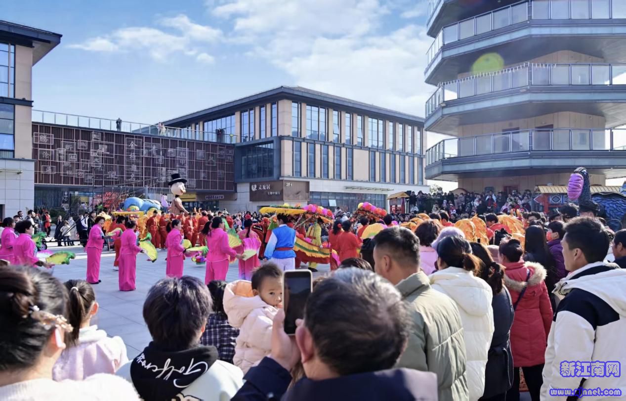 而渔湾景区同样是一派节日的欢腾景象,锣鼓喧天,旱船摇出满堂彩,大头娃娃诙谐搞怪,祥马玩偶萌趣出圈。金龙腾跃,福马踏春,舞者们甩开龙身、摆动龙尾,欢腾起舞。醒狮跳跃翻滚,步步生财,为游客送上马到成功、平安喜乐的新春祝福。
