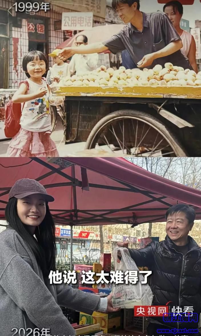 图源:网络网友们的评论千言万语,对比照让大家看到了不同的感人之处。有的网友看到了时代的飞速发展,“1999年还在用公用电话,2026年早已迈入‘5G+’时代”;有的网友看到了“吾家有女初长成”,也似乎看到“逐渐老去的自己”,这是岁月悄然无声的留痕;有人看到三十年如一日坚守自己的热爱,干一行爱一行,爱一行坚持一行;有的人看到老家街巷的“大变身”,人居环境的提升、社会治理的安定,勾起他乡游子的乡愁……照片上的他和她,是你,是我,是千千万万的“我们”。虽然平凡,但“平凡的人们给我最多感动”。这份“平凡”的人情味,也带来最直抵人心的触动。27年前,“水果叔叔”杨国平用一辆二手三轮车叫卖水果,兢兢业业30载,回头客越来越多,也拥有了属于自己的店面,在省会扎了根。这种细水长流的韧性虽不惊天动地,但不正是每一个努力打拼的追梦人的样子吗?更难能可贵的是,即便迎来“泼天的流量”,依然不浮躁、不功利。正如杨国平所言,“对我来说,这突如其来的关注已经是最大的惊喜,被记住的温暖、被认可的喜悦会永远留在我心里。我也不会因为一时的热度去改变初心,依旧会守好小店,接待好每一位信任和支持我的顾客,也希望大家都能吃到更好、更鲜、更甜的水果。”故事的女主@-MangoOo-表示,希望自己能像“水果叔叔”一样,在自己热爱的事情上长长久久地坚持下去,希望很多年后还能和叔叔再相遇,继续把这份温情和故事写下去,把更多温暖带给大家。从投币打电话到飞速发展的通讯方式,从流动摊贩到正规门店主,从小不点到亭亭玉立的“大人”,杨国平和MangoOo生活发生了巨大变化,城市发展、时代进步同样没有停下脚步。变迁无声,却浓缩了国力强盛、人民幸福、烟火人间的温暖盛世。大家之所以能“看得掉泪”“心头一颤”,是因为我们都是这些变化的亲历者,也是对过去的美好回望。时光会走远,影像能长存。愿我们都能在不饶人的岁月里,守住热爱,以奋斗为笔,以善良为墨,绘就自己的五彩人生。(黄泽文)