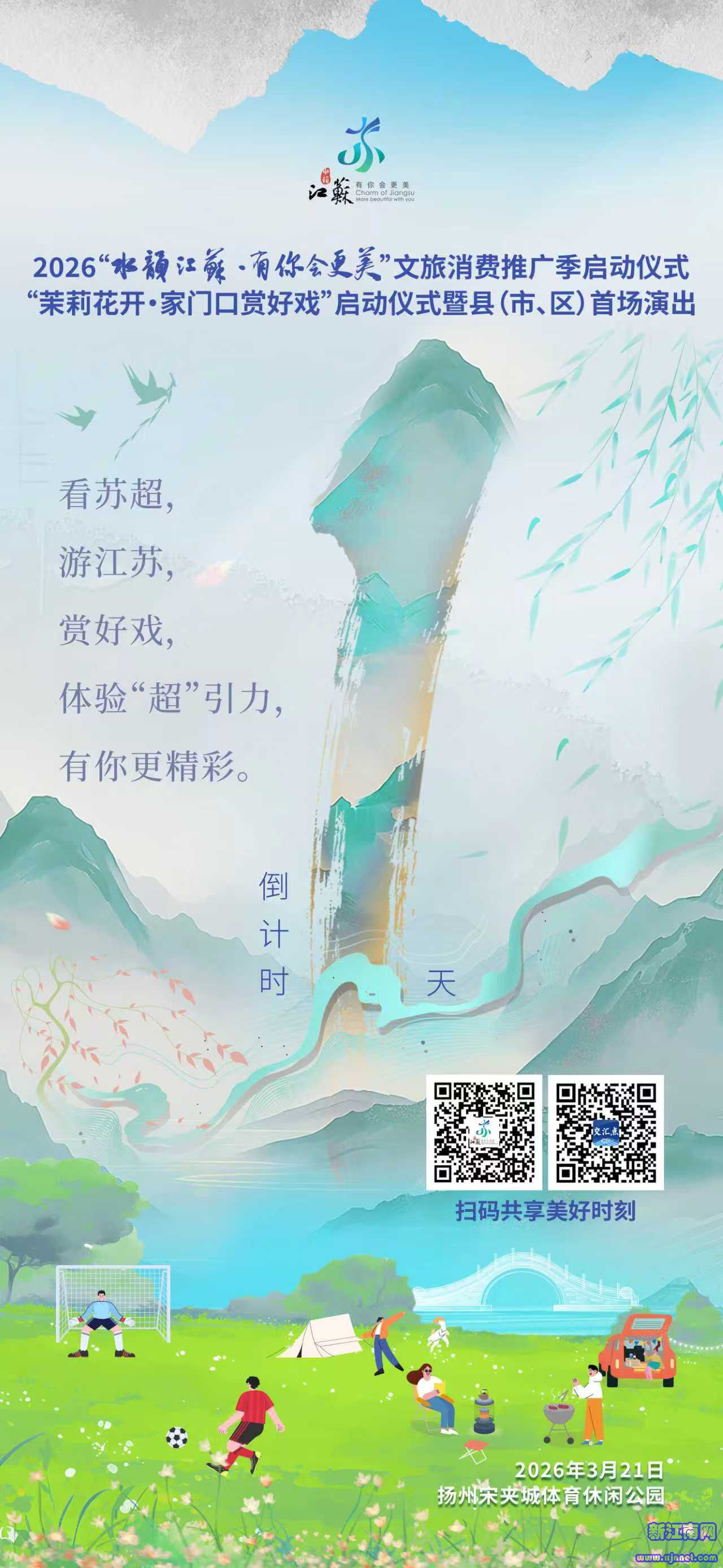春风拂江淮,繁花满江苏。3月21日,2026“水韵江苏·有你会更美”文旅消费推广季启动仪式将在扬州市宋夹城体育休闲公园盛大举行。文旅消费推广季将贯穿全年,以满满的诚意和丰富的活动,向四海宾朋发出春天的邀请。
