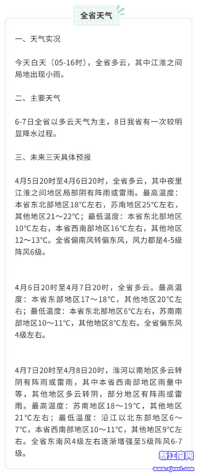 清明还开启了一年中风最大的时段,春风和煦、风力适宜,也是放风筝的好时候。截至昨天,春天的范围已经推进到北京、辽宁西部一带,广东、广西不少地方已经入夏,各地季节差异鲜明。常年到清明节气结束时,东北、西北地区东部也将加入春天的版图,春季面积将完成对冬季的反超,全国大部都将迎来春光最好的盛春时节。江苏也同步进入“最美人间四月天”,开启春日“百花大赏”,晚樱、紫藤、牡丹、郁金香、木绣球、琼花、杜鹃等花卉次第开放,处处生机盎然。今天是清明假期第二天,江苏白天全省以多云天气为主,阳光明媚、风和日丽,仅江淮之间局地出现小雨。气温继续攀升,14时,西南部和苏南大部分地区气温达到27~28℃,其他地区普遍在23~26℃,体感暖意融融,仿佛提前有了初夏的气息。未来五天江苏天气与气温起伏多变,预计7日有一次冷空气过程,8日全省将迎来一次较明显降水,在冷空气和降水共同影响下,气温将呈现波动变化。从气温走势来看,明天起至8日,全省最高气温将逐步回落,大部分城市最高温度下降至20℃上下,之后气温还将再次波动。4月5日20时至4月6日20时,全省多云,夜里江淮之间地区局部阴有阵雨或雷雨。最高温度:本省东北部地区18℃左右,苏南地区25℃左右,其他地区21~22℃;最低温度:本省东北部地区10℃左右,本省西南部地区16℃左右,其他地区12~13℃。全省偏南风转偏东风,风力都是4~5级阵风6级。4月6日20时至4月7日20时,全省多云。最高温度:本省东部地区17~18℃,其他地区20℃左右;最低温度:本省东北部地区6℃左右,苏南南部地区10~11℃,其他地区8℃左右。全省偏东风4级左右。4月7日20时至4月8日20时,淮河以南地区多云转阴有阵雨或雷雨,其中本省西南部地区雨量中等,其他地区多云转阴,部分地区有阵雨或雷雨。最高温度:苏南地区18~19℃,其他地区21℃左右;最低温度:沿江以北东部地区6~7℃,本省西南部地区10~11℃,其他地区9℃左右。全省东南风4级左右逐渐增强至5级阵风6~7级。