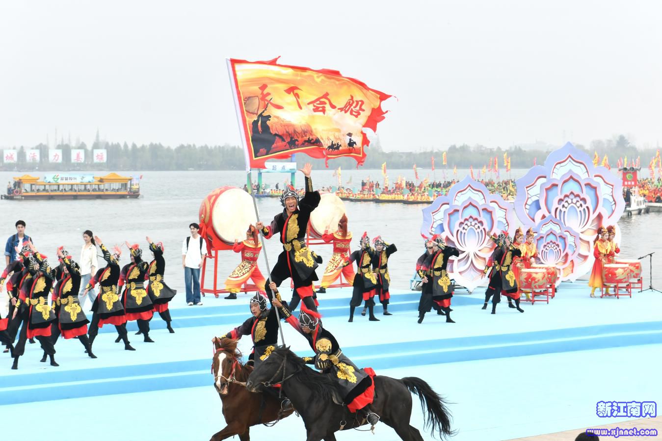 暖场环节,《泰有引力》趣味拔河赛、《黑马夺魁》蹴鞠挑战赛,邀请观众一起参与,燃动现场;互动演唱,歌手走进观众席,带领万名观众齐声高唱《歌唱祖国》,表达对祖国的热爱与祝福;民俗表演《三水四季歌》,精彩呈现姜堰滚莲湘、旱船、创意铜人等本土非遗技艺,展现水乡人民生产生活的五彩画卷。当观众还沉浸在岸边舞台上精彩的文艺演出中,水上会船表演已经拉开序幕。七条贡船依次向观礼台驶来,观众纷纷举起手机相机拍摄。