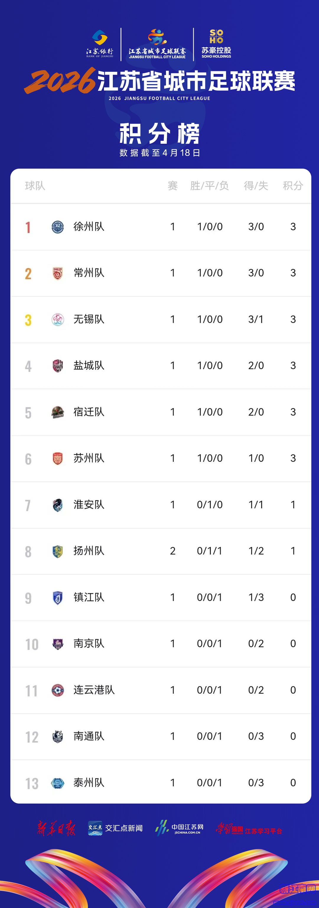 “苏超”最新积分榜出炉,徐州队常州队无锡队暂列前三