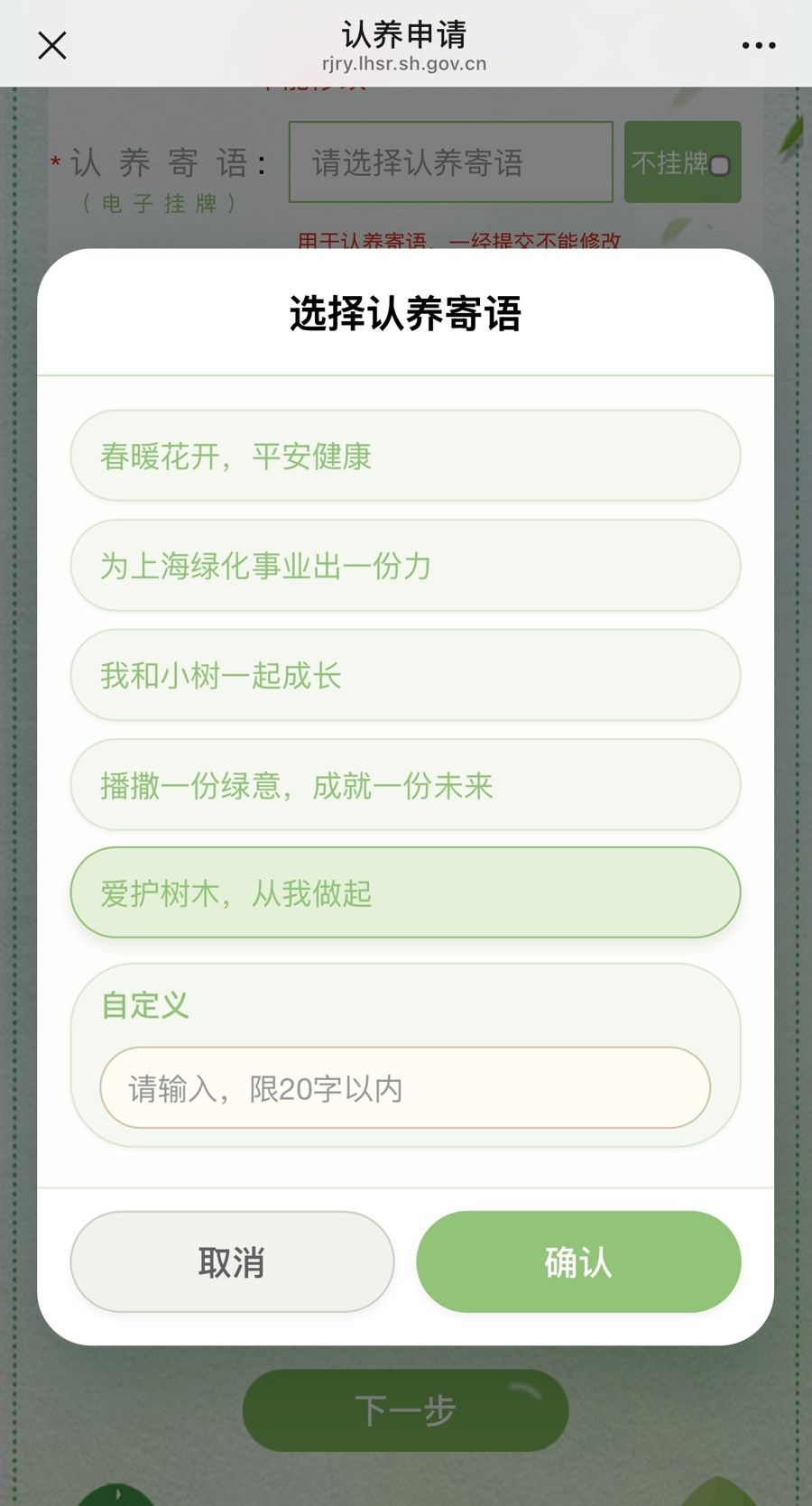 值得一提的是,平台也在不断拓展新功能,赋予树木更多情感链接。新民晚报记者注意到,今年的认养申请页面上,多了一栏“认养寄语”,市民可选择喜欢的寄语用于电子挂牌,也可以在“自定义”一栏中写下心声、心愿,或向“电子树洞”吐露秘密,寄托情感。此外,平台还开通了留言信箱,征集市民对功能优化、服务提升的意见建议,持续迭代升级,让全民尽责更人性化、更具互动性。