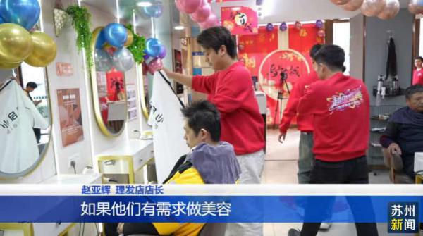 理发店店长赵亚辉说,都是做一些免费的剪发、洗发,现在天气马上也冷了,在外面也蛮辛苦的。如果他们有需求做美容或者是做一些烫发、染发,都会给一个半价的活动。