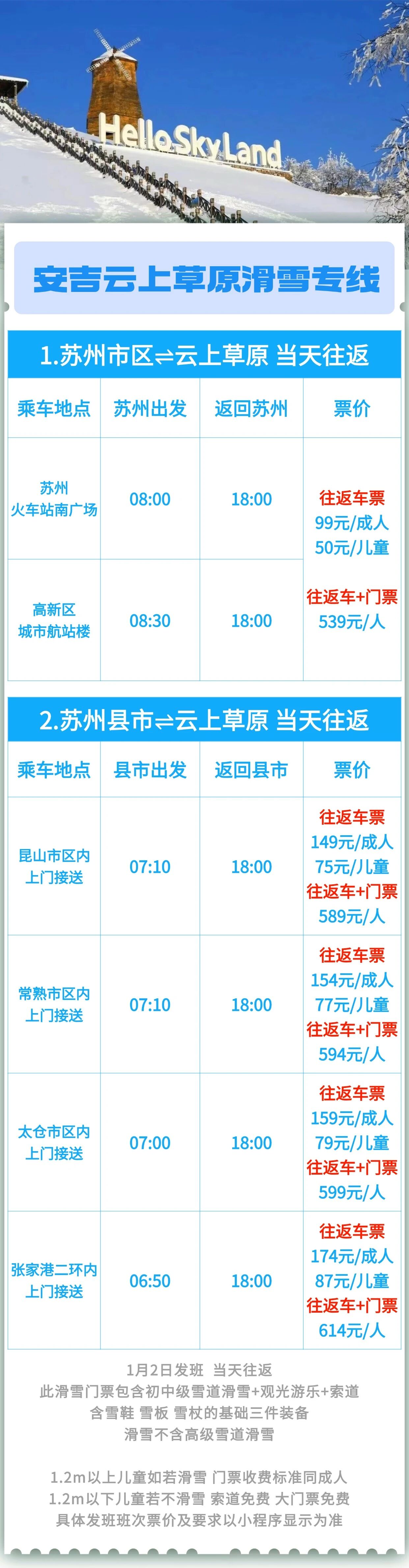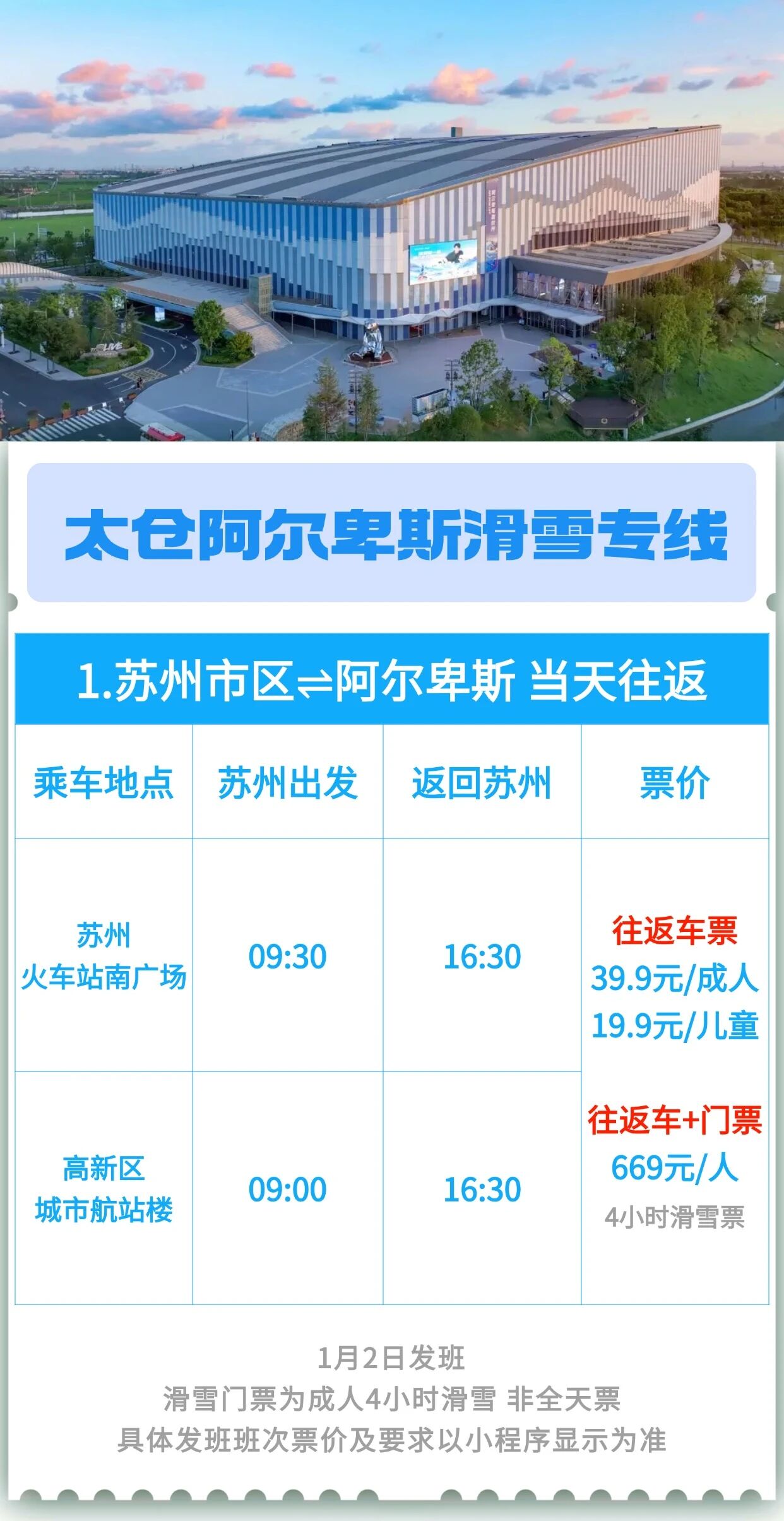 苏州滑雪专线元旦期间复班首发!直达两大特色雪场:室内恒温-太仓阿尔卑斯、户外高山-安吉云上草原,当天往返车票最低可至39.9元。