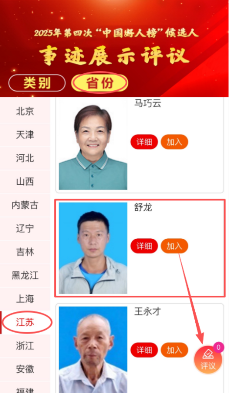 心存善心,平凡故事最暖心。大家可以扫描二维码,选择“省份”,在对应人物栏目选中候选人,点击“加入”和右下角的“评议”参与评议。