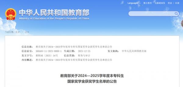 根据《财政部 教育部 人力资源社会保障部 退役军人部 中央军委国防动员部关于印发〈学生资助资金管理办法〉的通知》(财教〔2021〕310号)、《教育部 财政部关于印发〈本专科生国家奖学金评审办法〉的通知》(教财函〔2019〕105号)和《关于调整高等教育阶段和高中阶段国家奖助学金政策的通知》(财教〔2024〕181号)的相关规定,教育部、财政部联合成立了国家奖学金评审领导小组,设立了国家奖学金评审委员会,按照客观、公平、公正的原则,对各省(区、市)、计划单列市及新疆生产建设兵团教育部门,中央有关部门(单位)教育司(局)和教育部直属各高等学校报送的本专科生国家奖学金评审材料进行了认真评审,现将获奖学生名单予以公告。