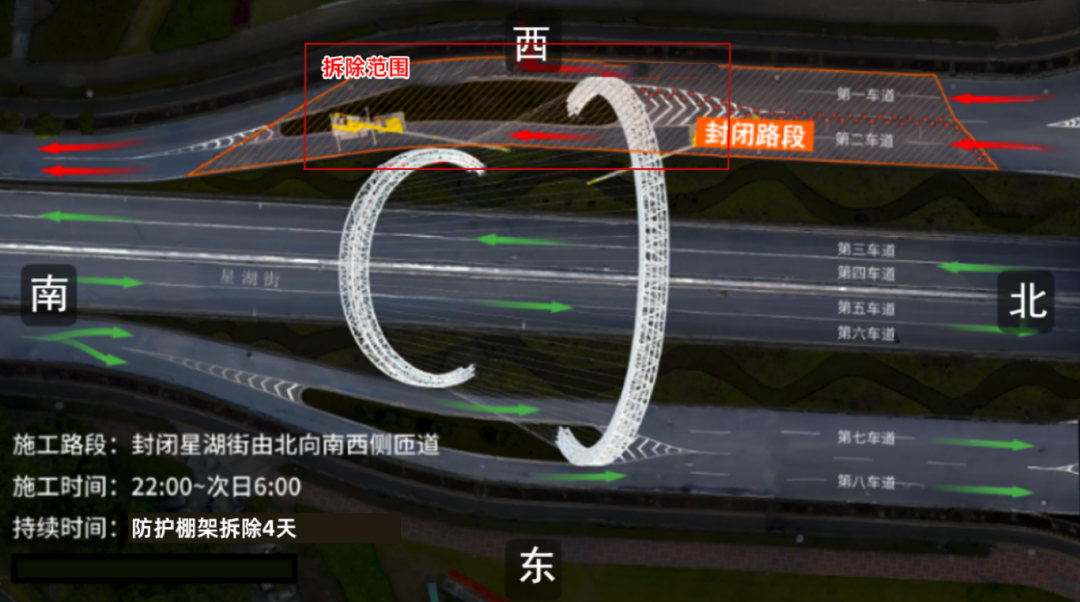 为保障防护棚拆除期间施工安全和基本通行需求,决定采取分幅分段的方式进行,施工期间对星湖街独墅湖大道路口南侧机动车道分批次采取临时交通管理措施(雨天顺延)。