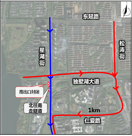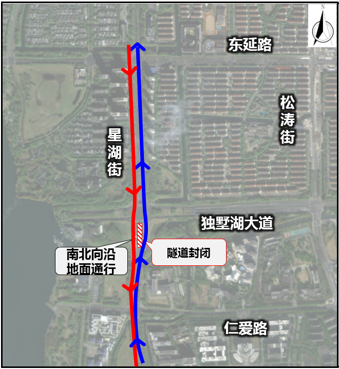 南向北、北向南直行机动车可选择星湖街地面辅道通行,其他方向机动车、非机动车及行人正常通行。
