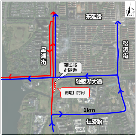 南向西左转、南向东右转机动车可从仁爱路-松涛街-独墅湖大道通行,其他方向机动车、非机动车及行人正常通行。