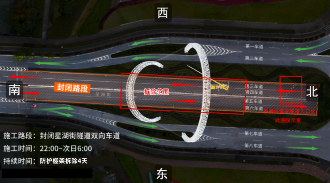 拆除:待雕塑养护结束后,2026年2月3日—2月6日夜间22时至次日6时临时封闭星湖街下穿独墅湖大道隧道,开展防护棚架拆除施工。