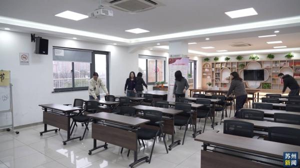 在苏州工业园区金苑社区党群服务中心寒托服务点,工作人员们正在为即将到来的小朋友们准备寒托教室。据了解,这个服务点将于2月9日开课。