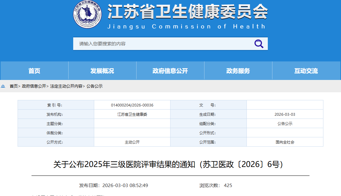 近日,江苏省卫生健康委员会发布了《关于公布2025年三级医院评审结果的通知》。