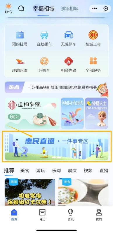 用户只需进入今日相城小程序,在“幸福相城”中,点击“惠民直通·一件事专区”进入应用。