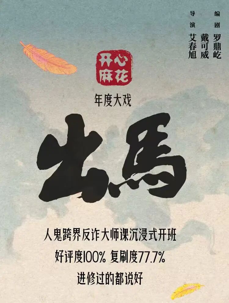 大麦评分9.7、豆瓣评分8.2,全国演出超500场、观众好评度近满分、2025话剧类票房第1名,再加上魏翔领衔主演!开心麻花惊怂悬疑喜剧《出马》这次,清明假期,连演三场,千万不要错过!