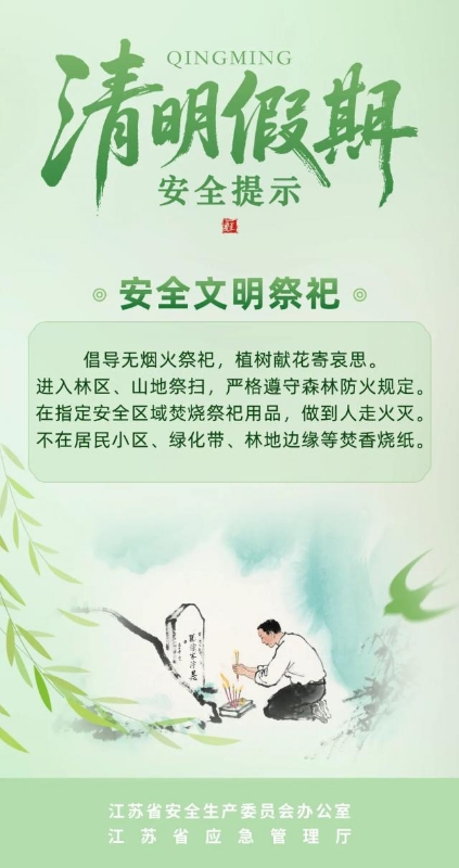 1.自觉遵守祭扫场所管理规定,严格落实禁火要求,不违规焚香、烧纸、燃放烟花爆竹,祭扫完毕后彻底清理火种,严防复燃;积极倡导鲜花祭扫、网络祭扫、植树缅怀等文明低碳祭扫方式。
