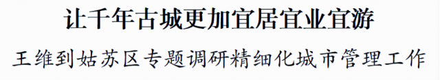 4月5日,市委副书记、代市长王维到姑苏区专题调研精细化城市管理工作,强调要深入学习贯彻习近平总书记关于城市工作的重要论述,始终坚持以人民为中心的发展思想,不断完善城市管理和服务,做到规划科学、治理精细、管理智慧,让人民群众在城市生活得更方便、更舒心、更美好。