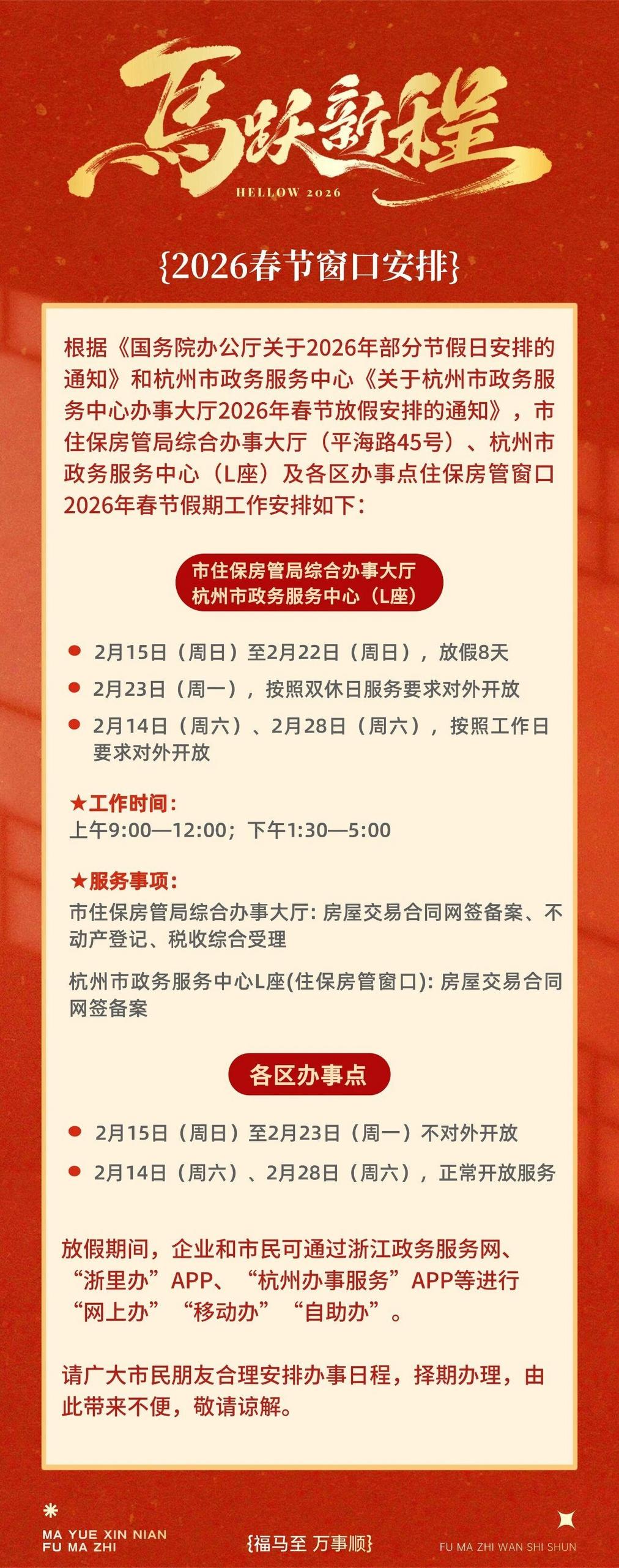 杭州市不动产登记服务中心放假时间为2026 年2月15日至2月22日,共计8天。2月14日(周六)、2月28日(周六)按照工作日模式办理相关业务,2月23日(周一,正月初七)按照双休日模式对外开放。春节期间,市民如需查询不动产权属信息、已受理业务的办证进度、办证所需资料和流程等事项,可通过浙江政务服务网、“浙里办” APP、“杭州城市大脑”APP、杭州办事综合自助终端机等渠道,进行 “网上办”“移动办”“自助办”。