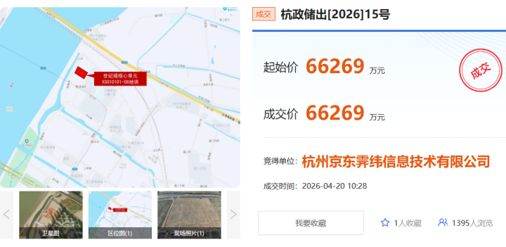 拿地的杭州京东霁纬信息技术有限公司成立于2025年04月07日,注册地位于浙江省杭州市萧山区盈丰街道双澜世环创新中心。该公司由北京京东世纪贸易有限公司100%持股。地块东至亚运村路、南至纬二路、西至观澜路、北至纬一路。西面距离钱塘江约160米,南面距地铁亚运村站、亚奥万象天地约150米,东面紧邻宁巢美地公寓五期人才共有产权保障住房。