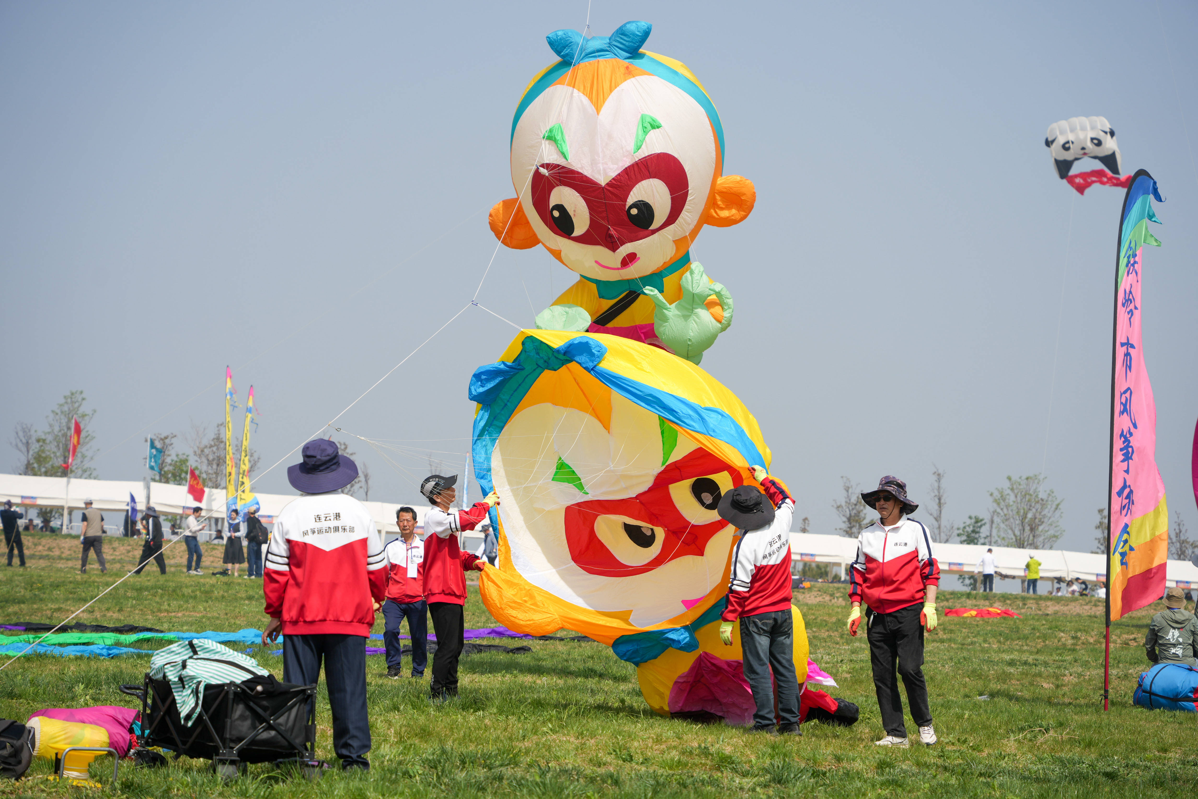 4月18日,参加第43届潍坊国际风筝会万人风筝放飞活动的风筝爱好者在放飞风筝。 新华社记者 徐速绘 摄