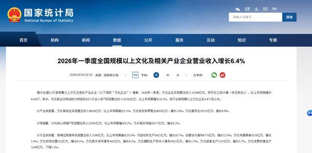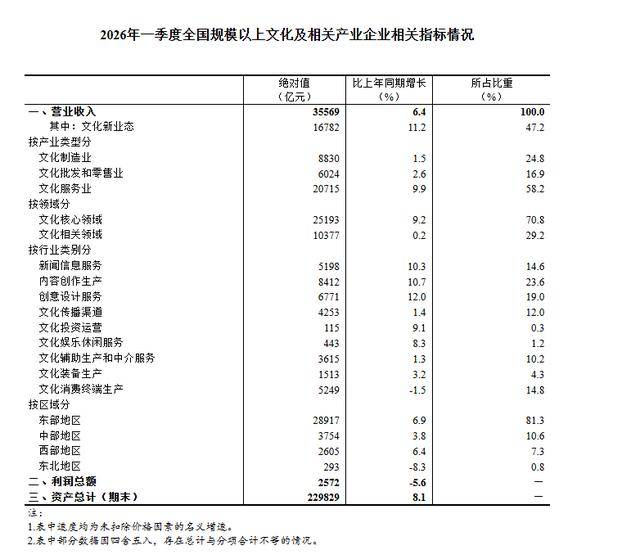 原标题:2026年一季度全国规模以上文化及相关产业企业营业收入增长6.4%