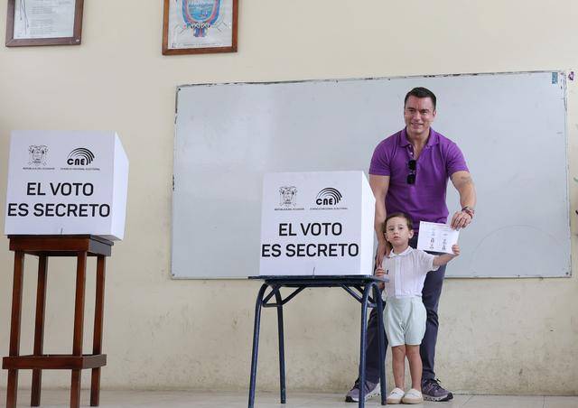 ↑4月13日,在厄瓜多尔西部圣埃伦娜省奥隆,“全国民主行动运动”总统候选人丹尼尔·诺沃亚参加投票。 新华社发(厄瓜多尔总统府供图)