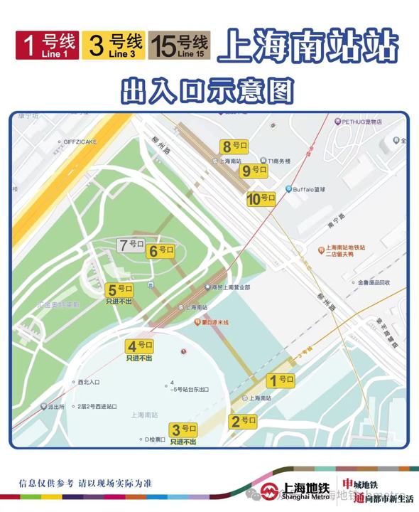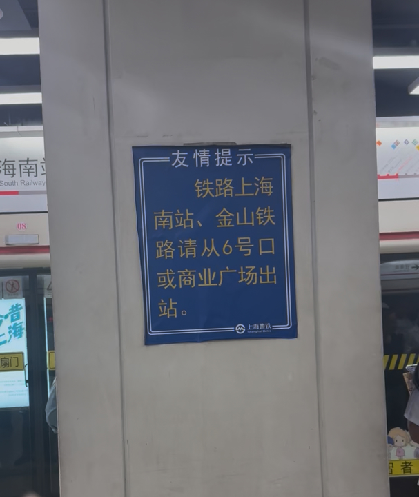 日前下午,记者乘坐地铁1号线到达上海南站站点。一下地铁,就能看到站台柱子上张贴着醒目的指引:“铁路上海南站、金山铁路请从6号口或商业广场出站。”而据投诉市民介绍,指引所导向的“6号口”可谓是上海南站进站的“最绕路线”。