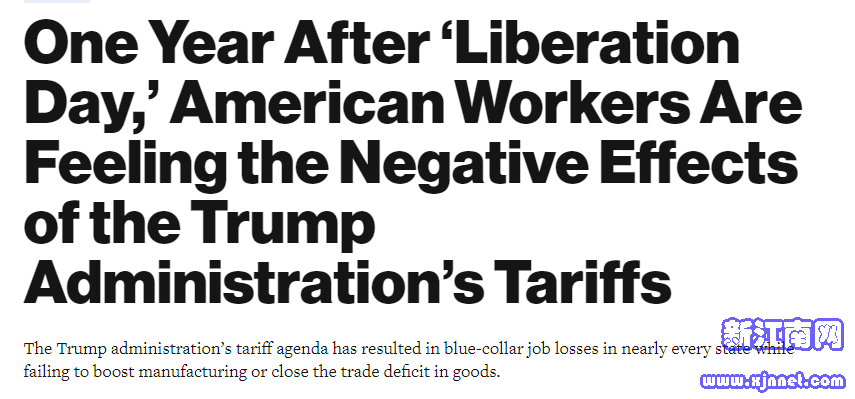 美国进步中心网站文章截图特朗普政府还废除了多项推动清洁能源、电池和半导体制造业增长的税收优惠与扶持政策。正因如此,过去一年美国小企业破产数量上升10%,大型企业破产数量达到2010年以来最高水平。而政策公告频繁、反复调整、豁免条款多变,再加上绕开国会推行关税的做法,更让中小制造企业难以制定长期规划。美联社以艾伦的公司进口自德国的柴油发动机为例称,若在美国本土生产这些机器,需投入2000万美元,这在关税政策前景不明的情况下无疑是巨大的投资风险。多伦多大学经济学家约瑟夫?斯坦伯格表示,当前情况与“理想状况”相去甚远,美国贸易政策的不确定性令企业不敢轻易扩大投资。艾伦也表示:“如果发动机制造商根本不知道3年后的形势如何,又怎么会投入这么多资金,把生产线从德国迁到美国。”美国进步中心的最新分析显示,特朗普政府执政第一年,美国制造业建设投资自2024年12月至2025年12月的跌幅达到14%,2024年11月至2025年11月的投资降幅,更是2017年夏季以来的最大跌幅。该中心还指出,在“解放日”之后的10个月里,美国制造业损失了8.9万个工作岗位,运输和仓储业失去12.37万个岗位。事实上,在所谓“解放日”之后,美国制造业几乎每月都在流失工作岗位。由于制造商因特朗普政府的关税政策而收缩业务,制造业经济活动连续8个月萎缩。此外,建筑、采矿和伐木等行业就业同样增长乏力。文章表示,特朗普政府的贸易政策让美国工薪阶层的处境雪上加霜,无论是就业前景还是日常商品支付能力。美国外交关系协会今年1月的民调显示,超过65%的受访者称,关税让各类日常商品更难负担。从2025年2月到2026年1月,关税使美国家庭平均多支出1700美元。此外,特朗普政府声称需要加征关税以降低制成品的贸易逆差,但去年美国的商品贸易逆差达到了历史最高水平。数据显示,许多进口商并未将产能迁回美国,只是转而购买其他海外国家的产品。文章最后写道,迄今为止,除了推高物价、造成失业、破坏国际信任、导致小企业破产激增之外,特朗普政府的贸易政策究竟取得了什么成果?答案是:几乎没有。特朗普政府未能实现其寻求的成果,反而造成更具破坏性的惊人高昂代价。