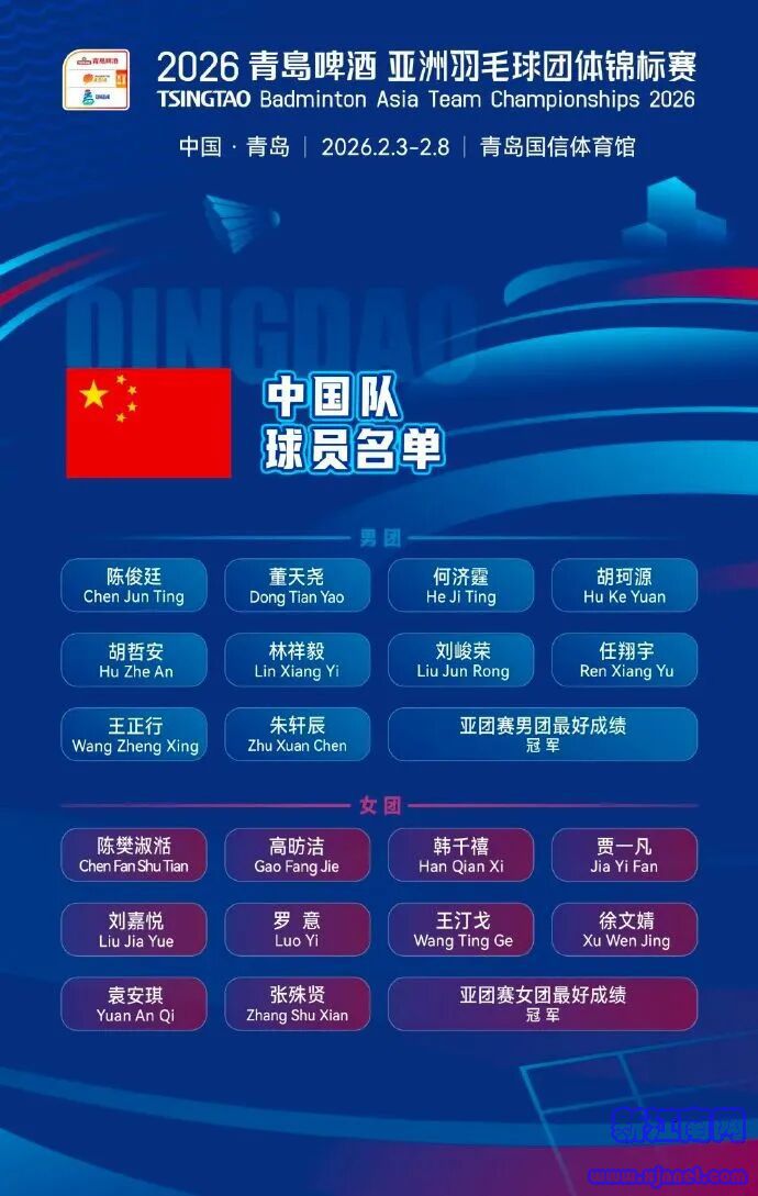 2月3日至8日,2026亚洲羽毛球团体锦标赛将在青岛国信体育馆举行,根据中国队公布的参赛名单,来自江苏的羽毛球运动员高昉洁、徐文婧随队参赛。