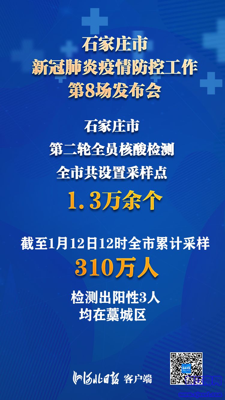 截至1月12日12时,全市累计采样3101776人,28家检测机构累计接收1501366人,检测出阳性3人(都在藁城区西关镇)。
