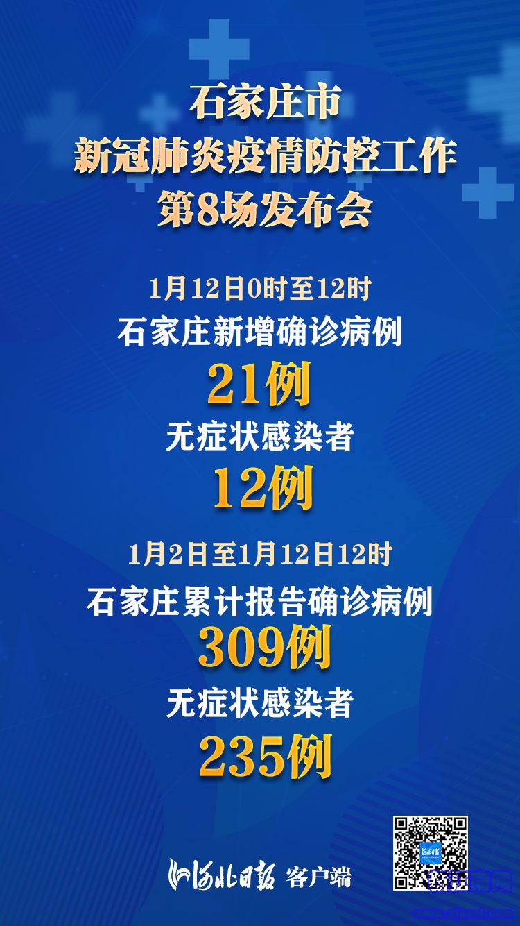 1月12日0时至12时,石家庄市新增确诊病例21例,无症状感染者12例 。