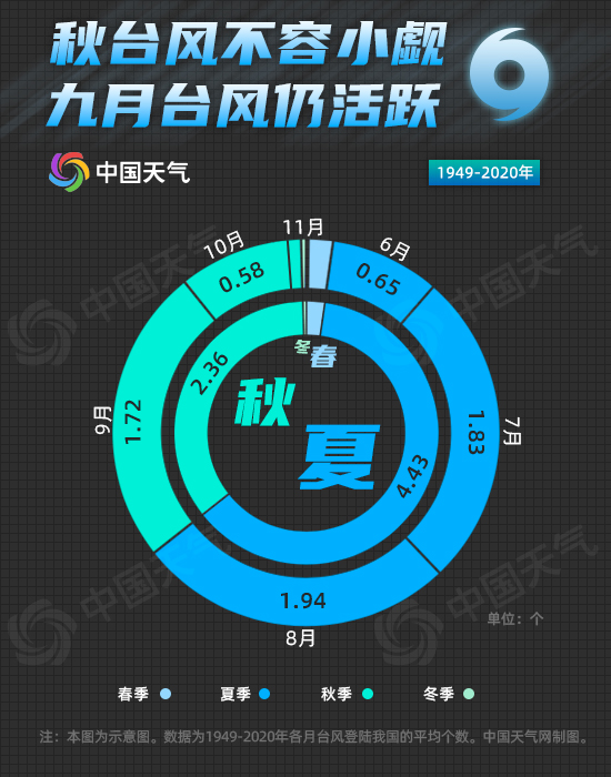 秋季中,9月最活跃,平均登陆个数达到1.72个,仅次于台风活动最频繁的8月(1.94个)和7月(1.83个),差异较小。