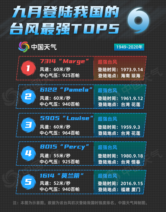 9月登陆我国最强的台风要数1973年第14号台风“Marge”,据中央气象台资料显示,台风“Marge”于9月14日凌晨登陆海南琼海,中心附近最大风速60米/秒,中心最低气压925百帕。据新华社消息,该台风共造成海南省926人死亡、1690人重伤、4470人轻伤,12.6万间房屋倒塌,损失惨重。