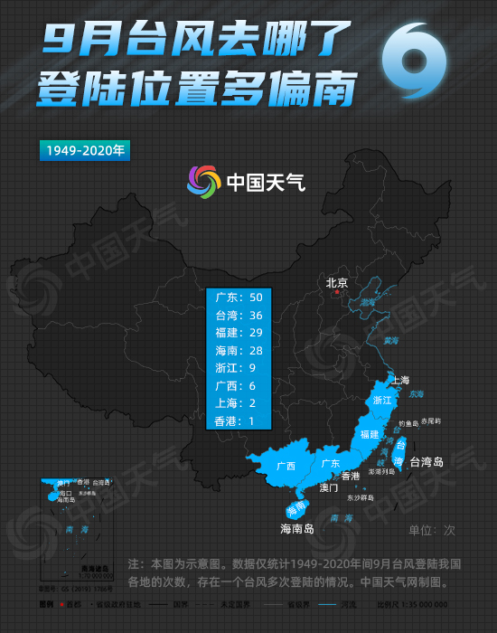 以9月为例,登陆我国的台风集中在偏南地区,无一台风登陆江苏及其以北地区。最扎堆的地方要数广东和台湾,其次是福建和海南,总体位置偏南。