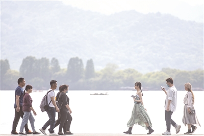 昨天的西湖边,游客们走在阳光下,似乎到了初夏。 记者 夏阳 摄