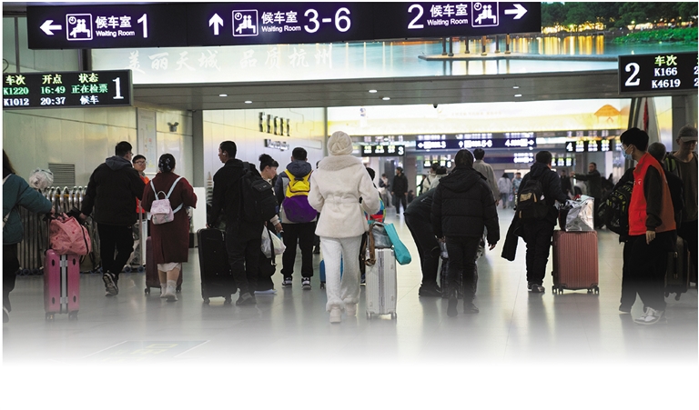 “大家把行李放在身边,一个一个来,不要着急”“携带大件行李的乘客请走这边”……在杭州站,记者看到处处都是等待乘车的旅客,背着大包小包、拉着箱子,在车站工作人员以及志愿者的引导下,售票、取票、安检、候车、进站,现场安全平稳有序。
