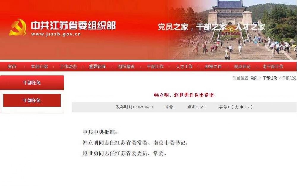荔枝新闻讯 中共中央批准:韩立明同志任江苏省委常委、南京市委书记;赵世勇同志任江苏省委委员、常委。