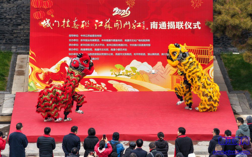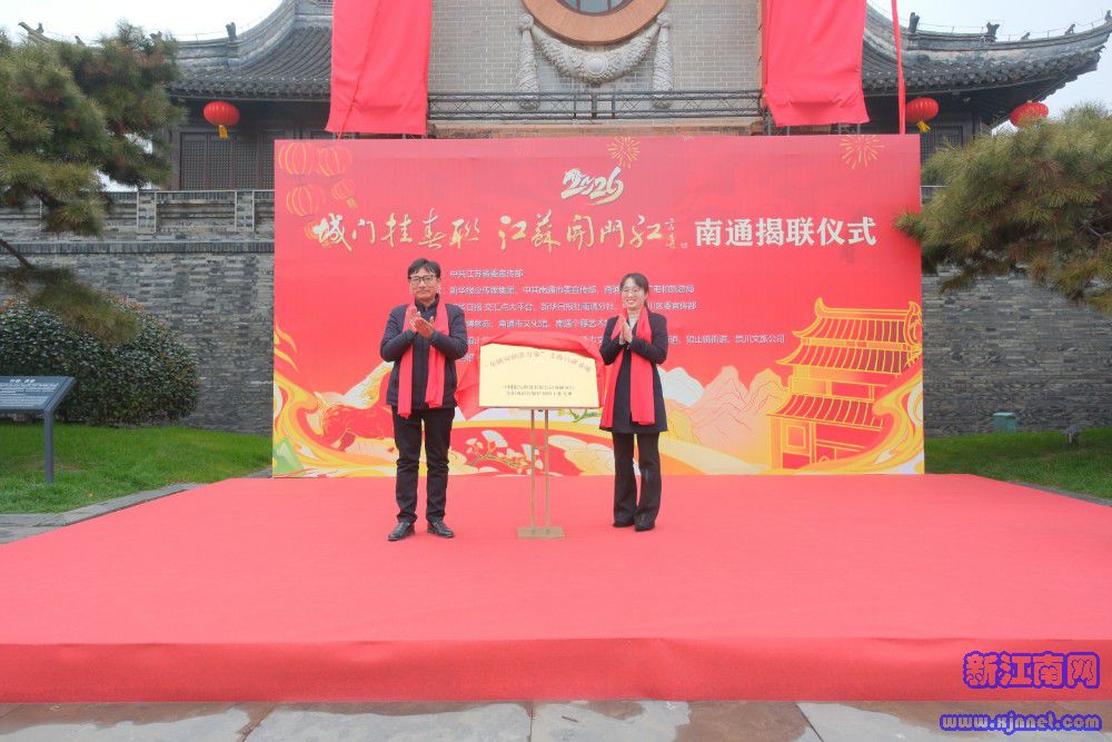 中国江苏网讯 钟灵毓秀联添彩,福满通城春满怀。2月10日,百年钟楼、狼山南门两大城市地标喜挂巨幅春联,2026年“城门挂春联 江苏开门红”南通揭联仪式盛大启幕。两副春联惊艳亮相,为通城勾勒出浓浓年味,正式开启马年新春的喜庆篇章。