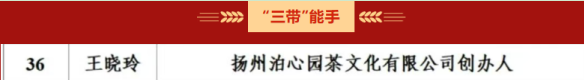 此次入选的“三带”能手王晓玲,是扬州泊心园茶文化有限公司的代表人物。长期以来,她深耕茶文化领域,不仅致力于传统茶文化的传承与推广,还通过创新经营模式,将茶文化与乡村旅游、休闲农业相结合,带动周边农户参与茶叶种植、茶文化体验等产业链环节,为当地产业发展和群众增收注入了新活力,成为“带领技艺传承、带强产业发展、带动群众致富”的典范。