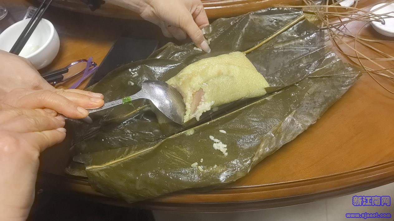 我是个不爱吃粽子的人,但是谁抵得过一句“这种粽子方方正正,四平八稳,八方来财”呢。枕头粽以糯米为主料,包着五花肉和去皮绿豆馅,口感咸鲜,带着植物清香,感觉比嘉兴肉粽略清淡一些。奔着“八方来财”,全家上阵,一个大粽子一口没剩。